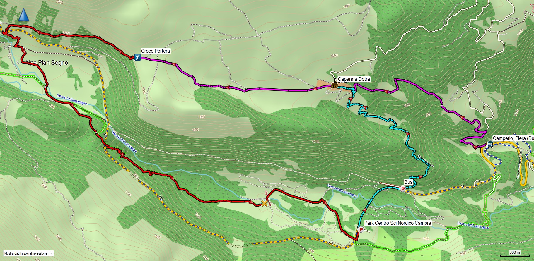 Sono possibili due punti di partenza, da Piera ( traccia magenta ) o da Campra (traccia ciano ), in funzione della possibilità di trovare parcheggi liberi. Partendo dal centro sci nordico il percorso si allunga di circa 1.5 km e si potrebbe anche fare un percorso ad anello (traccia rossa ) scendendo da Croce Portera verso Acquacalda e da qui a Campra. Purtroppo questo anello risulta al momento impossibile in quanto il sentiero lungo il torrente Brenno è impraticabile ed il sentiero è chiuso sino alla fine di aprile 2026