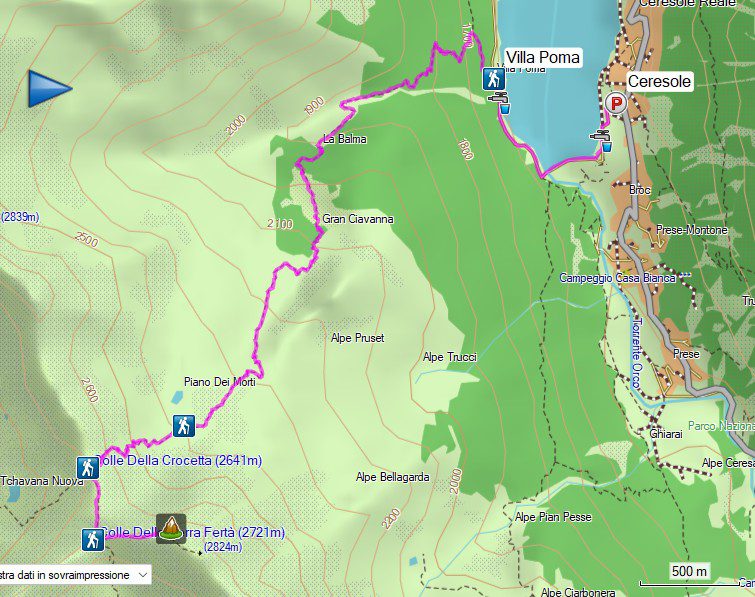 “Lasciate le auto nei pressi di Villa Poma( se consentito arrivarci in auto ) , saliti sulla sterrata, in salita nel bosco fino al bivio con indicazione Colle della Crocetta, sentiero n° 520, percorso GTA e AVC. Seguire il sentiero toccando le baite La Balma, Gran Ciavana e Fumanova, per giungere poi al Colle della Crocetta. Per la cima si prosegue a sinistra per sentiero a mezzacosta sul versante della Val Grande di Lanzo, fino a raggiungere il Colle della Terra Fertà (2721 m). Seguire la cresta che in direzione N porta alla cima (2831 m).
