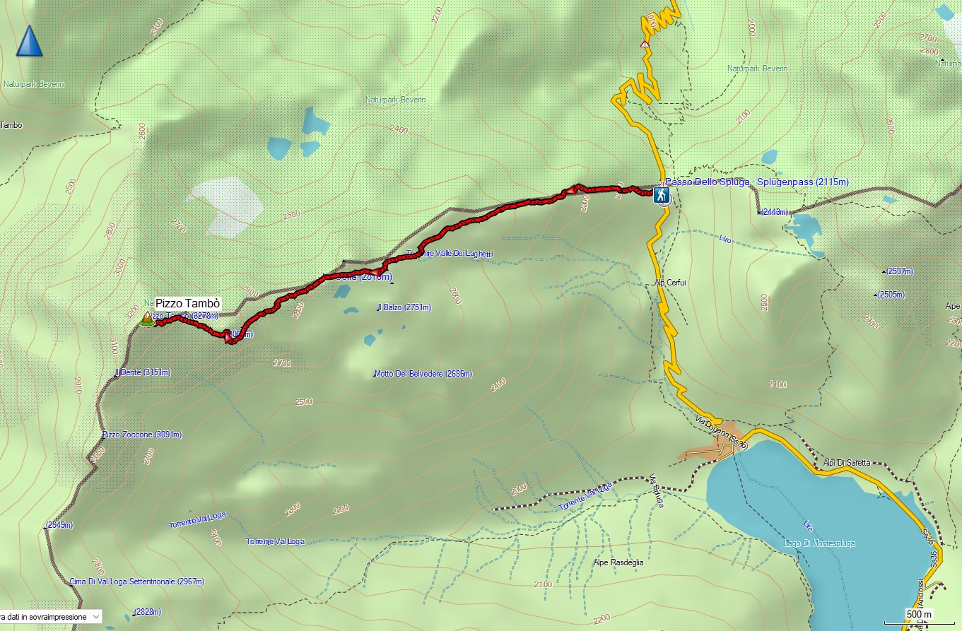 La via più facile e più frequentata che porta al Piz Tambo. Una breve gita giornaliera che parte dallo Splügenpass e che può essere effettuata in tarda stagione senza toccare neve o ghiaccio. Ciò che resta del ghiacciaio “Vedretta della Spianata” nella conca a SE della vetta si sta sciogliendo sempre di più. La via non è ufficialmente marcata ma per lunghi tratti sono presenti evidenti tracce di sentiero e ometti in sassi.